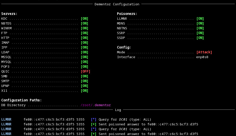 The database (DementorDB) is responsible for storing all captured credentials, password hashes, and host-related information. The configuration allows you to define both the database engine (DBMS) and the storage location. By default, Dementor uses a local SQLite database named Dementor.db, located in the workspace directory.